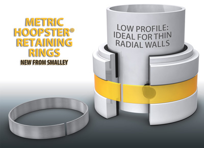 Smalley Steel Ring Company announces the launch of the new Metric Hoopster Retaining Rings. The new Metric Hoopster Retaining Rings offer an innovative way to retain mechanical components when space is a problem. The Hoopster's minimal radial projection and shallow groove depth allows the Hoopster to fit where regular stamped rings and retaining rings cannot.