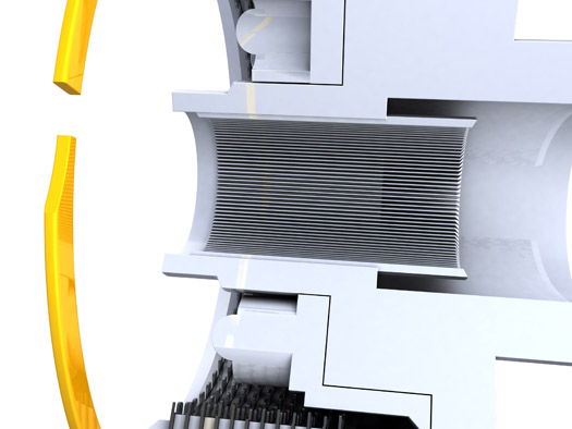 In dieser Anwendung bietet der Spirolox® Sicherungsring eine widerstandsfähige Auflagefläche für die Wellenfeder. Bei Bedarf kann der Ring unkompliziert ausgetauscht werden. Wenn das Drehmoment der Kupplung die Kraft der Wellenfeder übersteigt, beginnen die beiden Hauptkomponenten, sich unabhängig voneinander zu drehen und einen Rutschmechanismus in Gang zu setzen. Sobald das Drehmoment geringer wird und einen bestimmten Grenzwert unterschreitet, sperren die Kerben erneut die Einheit, um die Kraft von einem Ende zum anderen zu übertragen.